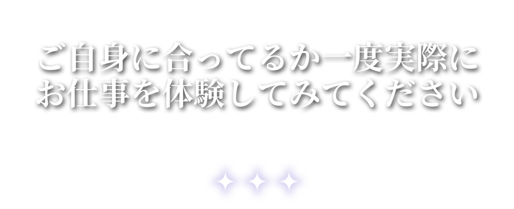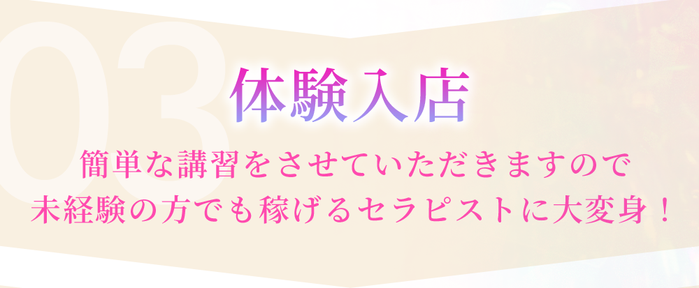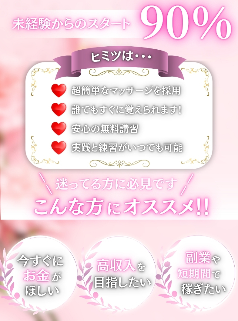マニュアルあり&スタッフさんのサポートもバッチリ◎ 当店のセラピストさんの8割は未経験者からのスタートです! わからないところはご理解頂けるまで何度でもご説明致します! お話を聞くだけでも大丈夫です! 是非ご連絡ください♪